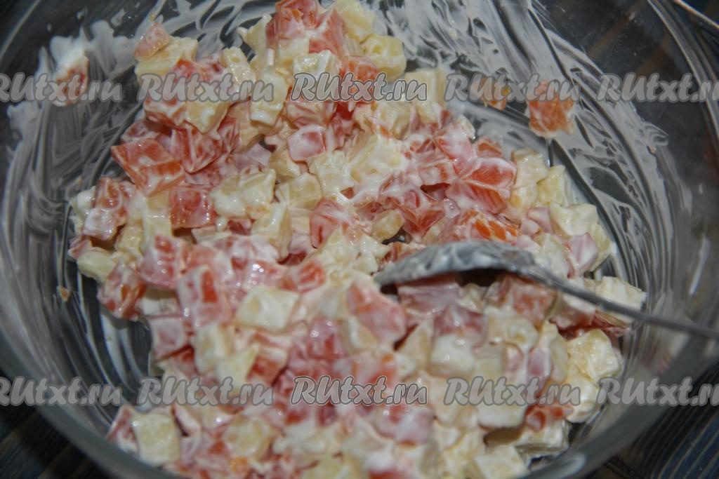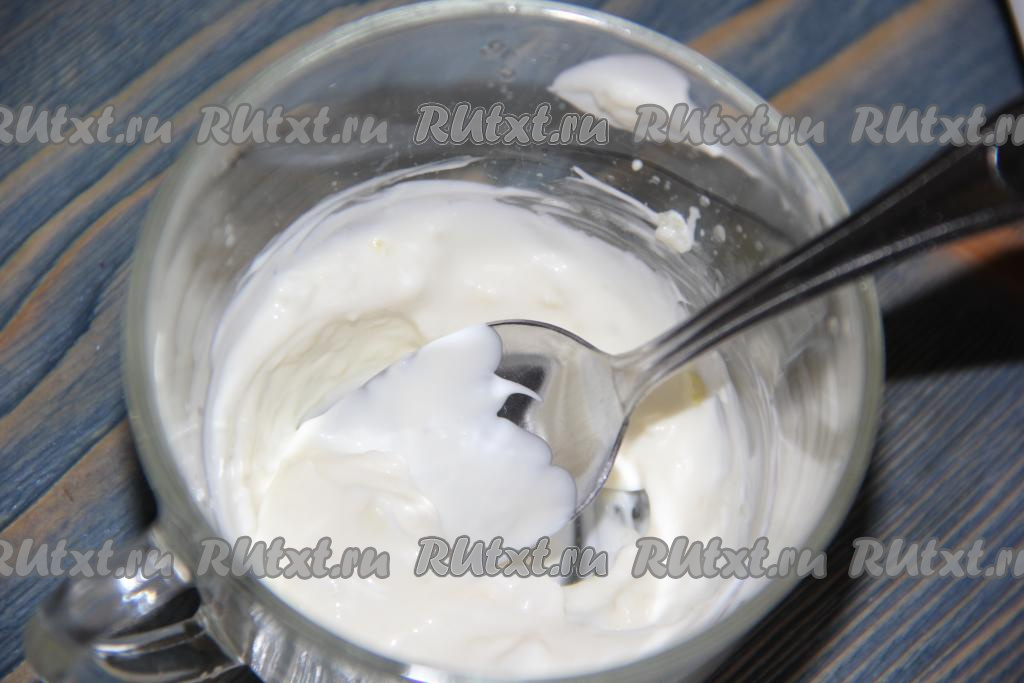 Очищенный чеснок пропустить через пресс и соединить с 2 столовыми ложками майонеза, хорошо перемешать.