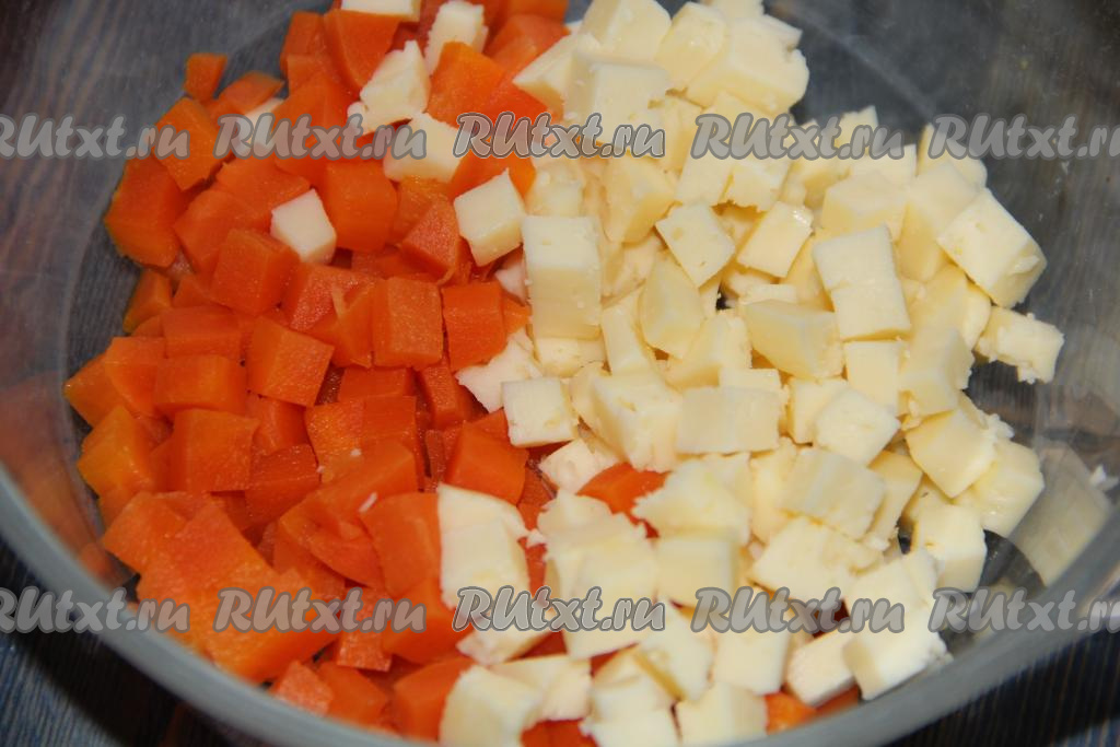 Сыр и морковь нарезать на кубики.