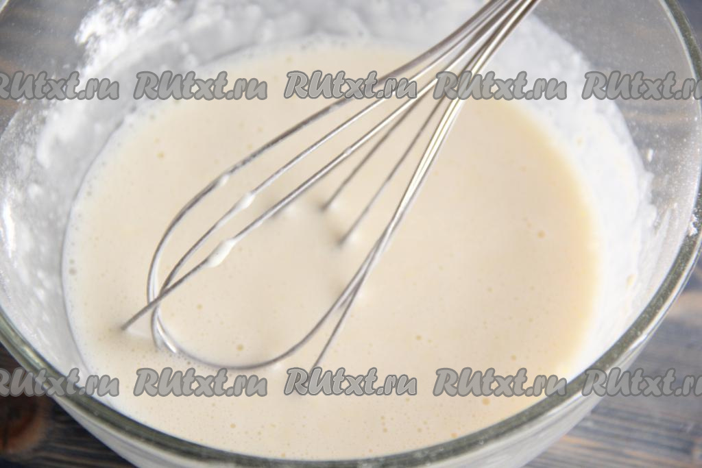 Перемешать молочно-мучную смесь венчиком до однородного состояния.