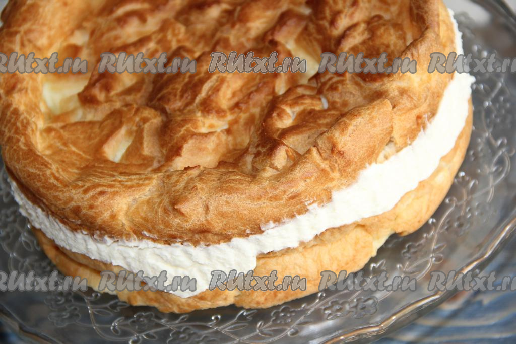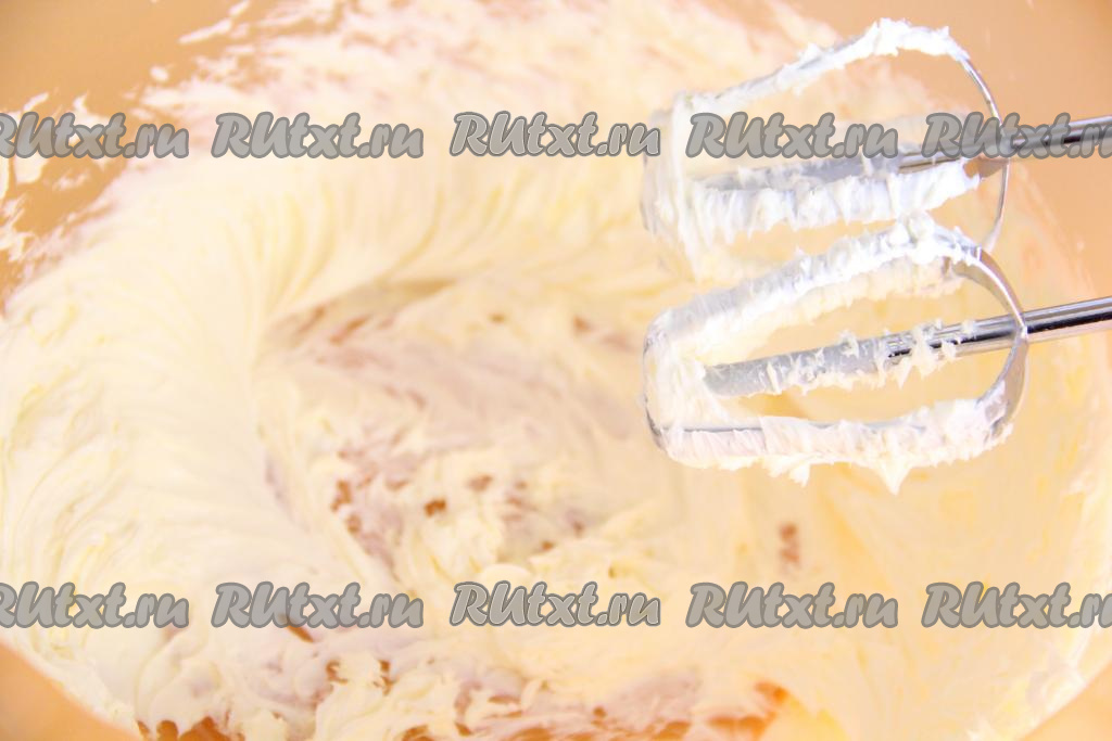 Таким же образом испечь второй корж. Заварные коржи остудить и освободить от пергамента. Сливочное масло для крема предварительно размягчить при комнатной температуре. Взбить масло миксером в течение 5 минут.