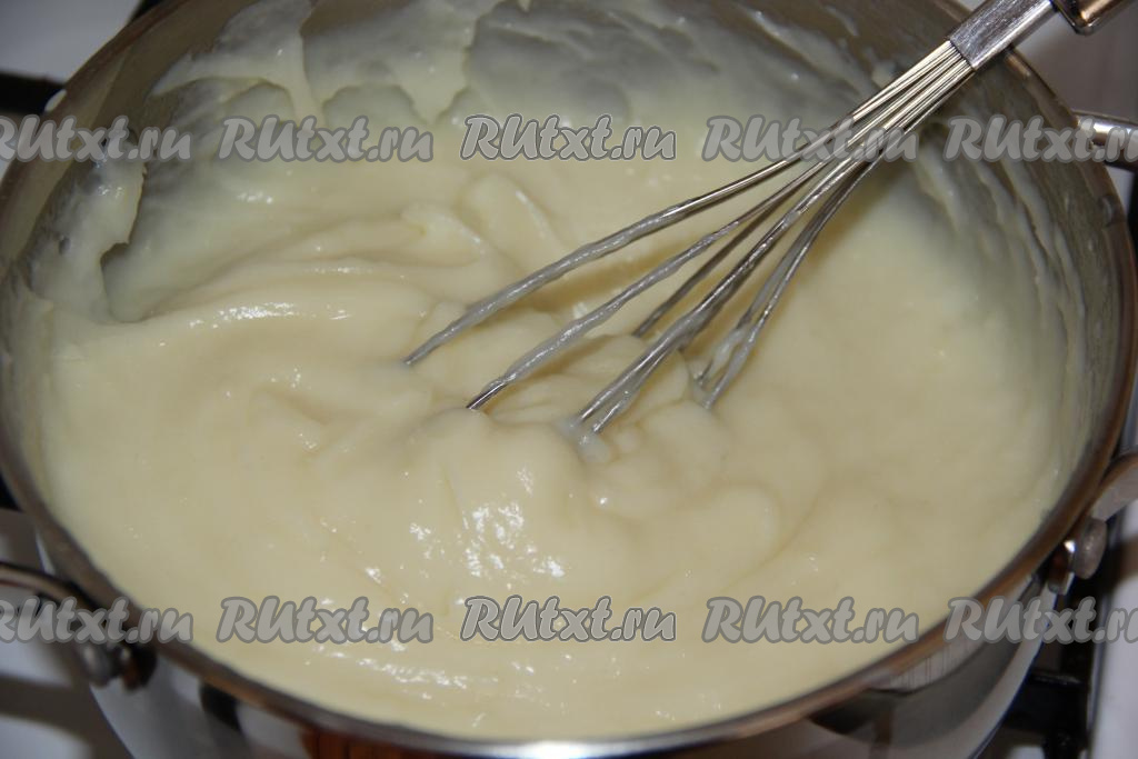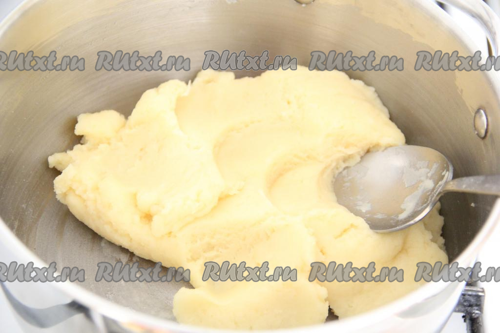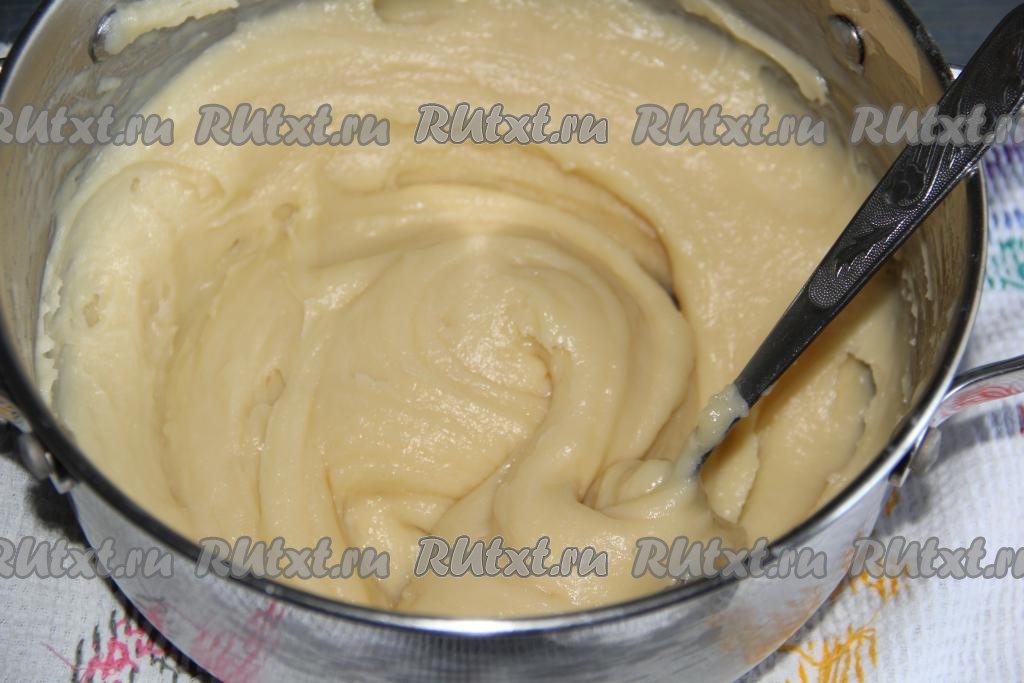Снять тесто с огня и немного остудить. Затем добавлять яйца по одному, тщательно перемешивая тесто после каждого яйца.