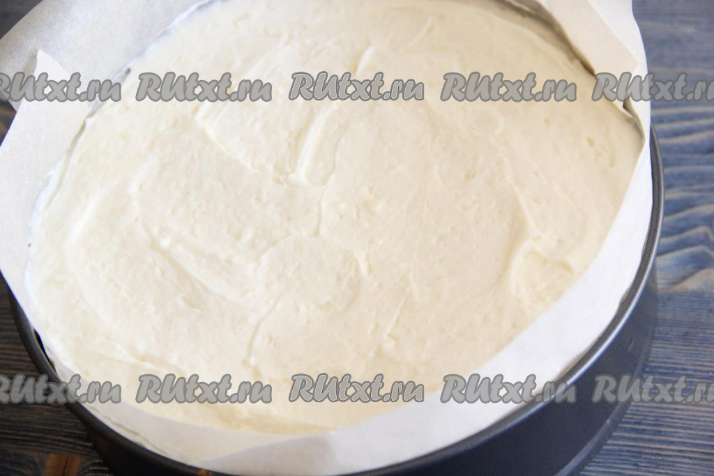 Дно и бока разъёмной форму выстелить пергаментом. На дно формы выложить один корж.