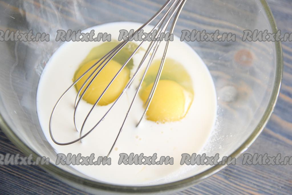 Отдельно в 200 мл молока добавить яйца и слегка взбить венчиком.