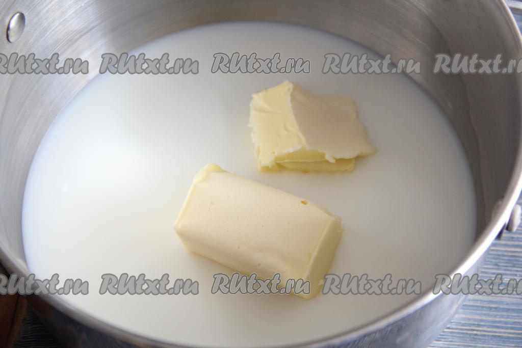 Пока наш заварной крем остывает, приготовим коржи, для этого в толстостенную кастрюлю нужно влить молоко и воду. Добавить масло и соль. Поставить на огонь.