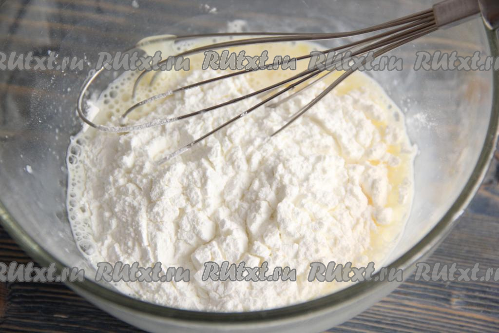 Затем в молочно-яичную смесь добавить муку и крахмал.