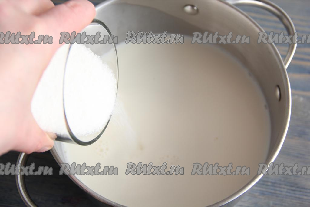 Для начала приготовить заварной крем, для этого в кастрюльку влить 400 мл молока, всыпать сахар и ванильный сахар, перемешать.