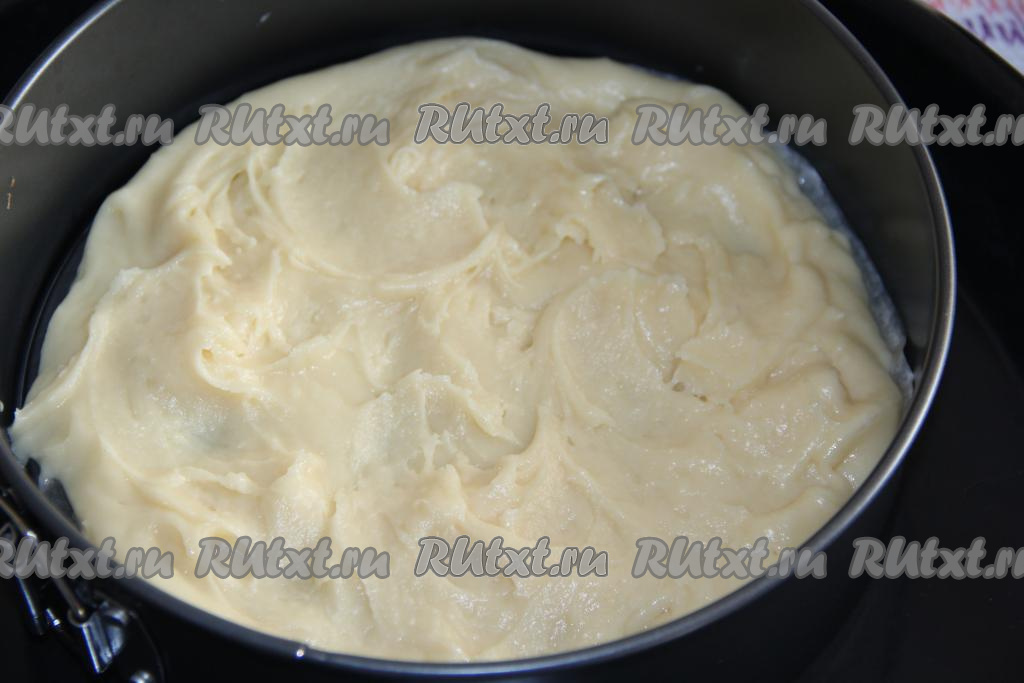 Разъёмную форму (диаметр моей формы 24 см) застелить пергаментом. Выложить одну часть теста в форму и сформировать волны с помощью ложки (как на фото).
