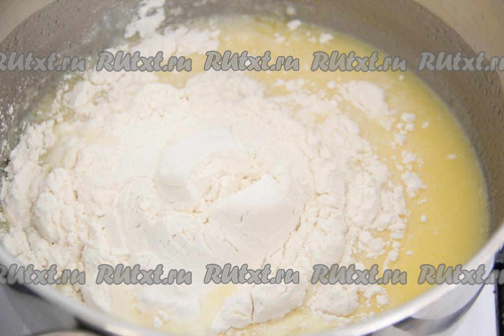 На медленном огне интенсивно перемешать муку. Заваривать тесто, перемешивая, в течение 1 минуты. Оно начнёт хорошо отставать от стенок кастрюли.