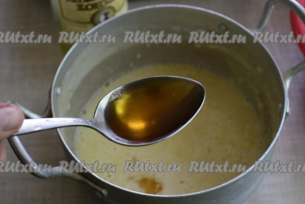 Добавим к тесту растительное масло и коньяк.