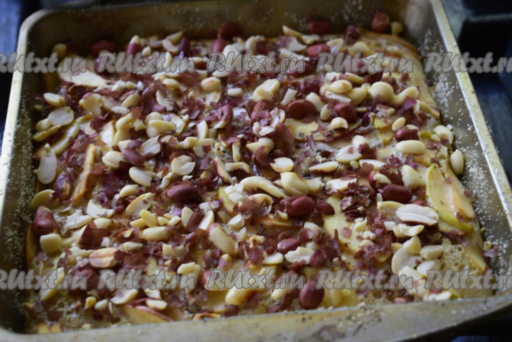 Ставим форму в разогретую духовку и выпекаем пирог с яблоками при температуре 180 градусов 30 минут. Пока печется яблочный пирог, приготовим заливку. Для приготовления заливки надо смешать растопленное не горячее сливочное масло, оставшийся сахар и яйцо, тщательно перемешать. После 30 минут достаем наш пирог и заливаем его получившейся заливкой, сверху посыпаем орехами и отправляем допекаться в духовку еще на 10-15 минут.