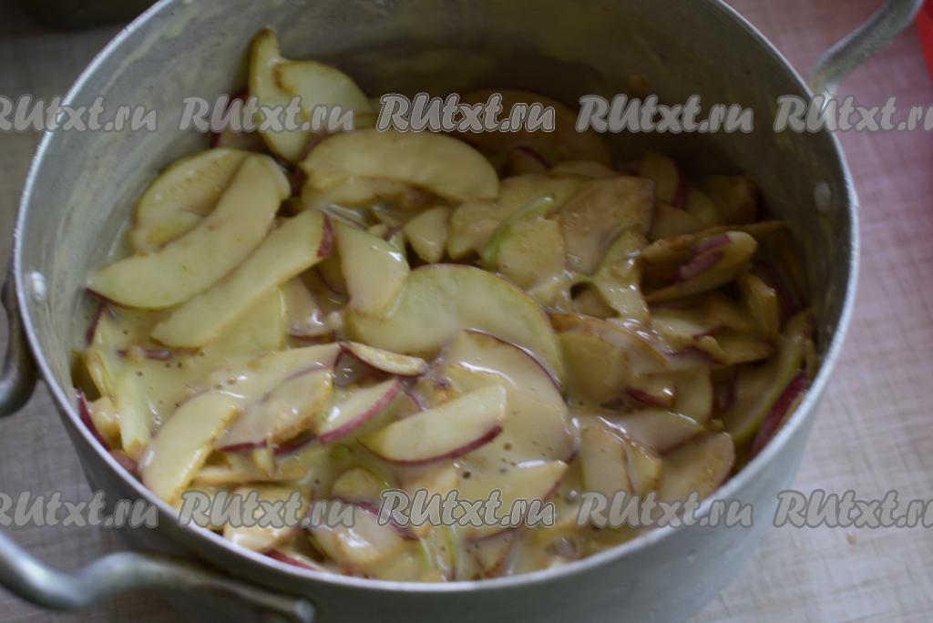 Добавим к тесту яблоки и перемешаем их так, чтобы каждая долька была покрыта тестом.