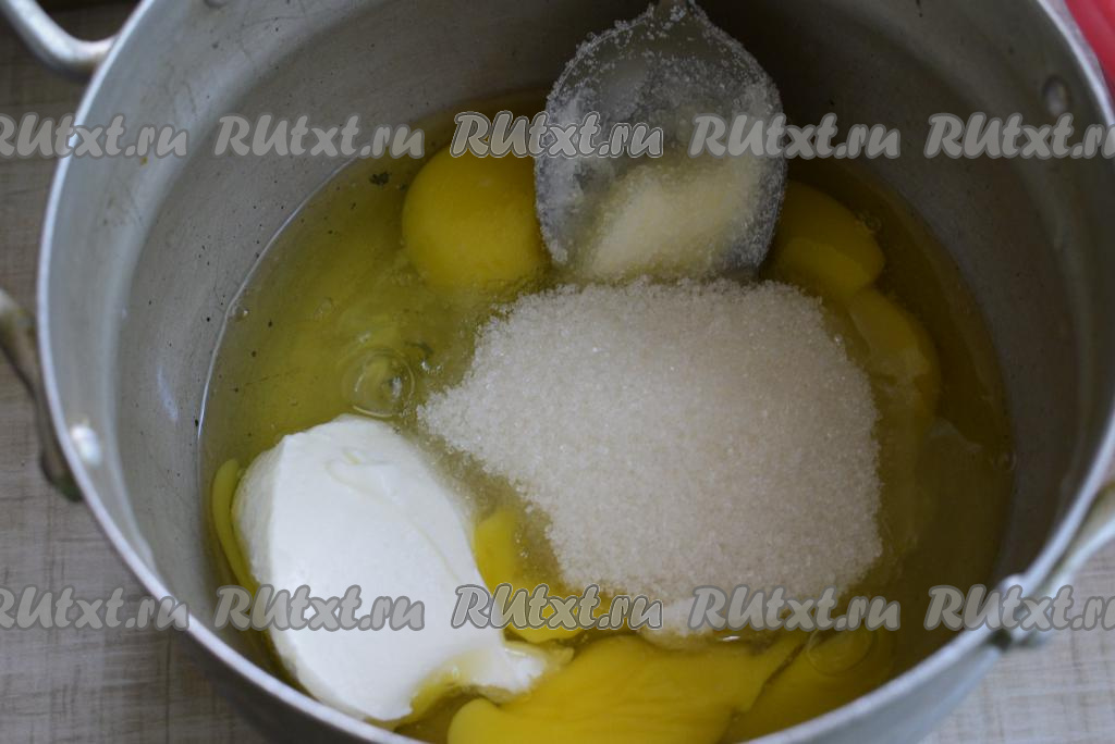 В миску вобьем 2 яйца (к моему удивлению яйца у меня оказались двухжелтковые), добавим 80 грамм сахара и сметану, перемешаем до однородности.