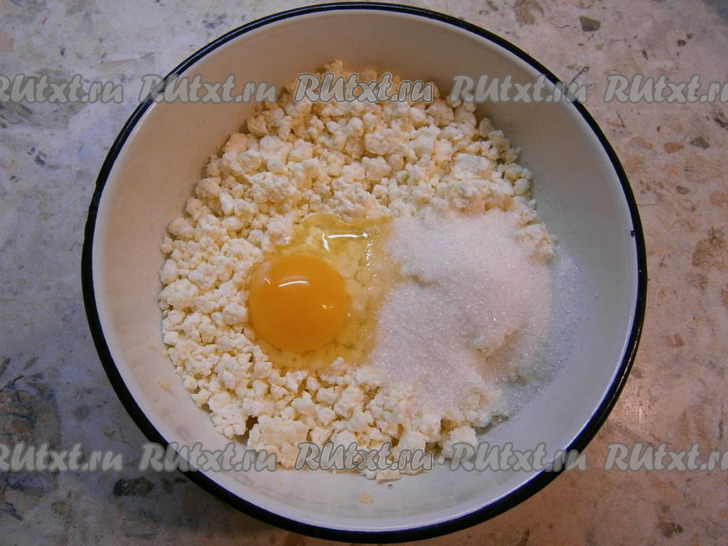 В творог добавить щепотку соли, сырое яйцо и всыпать сахар.