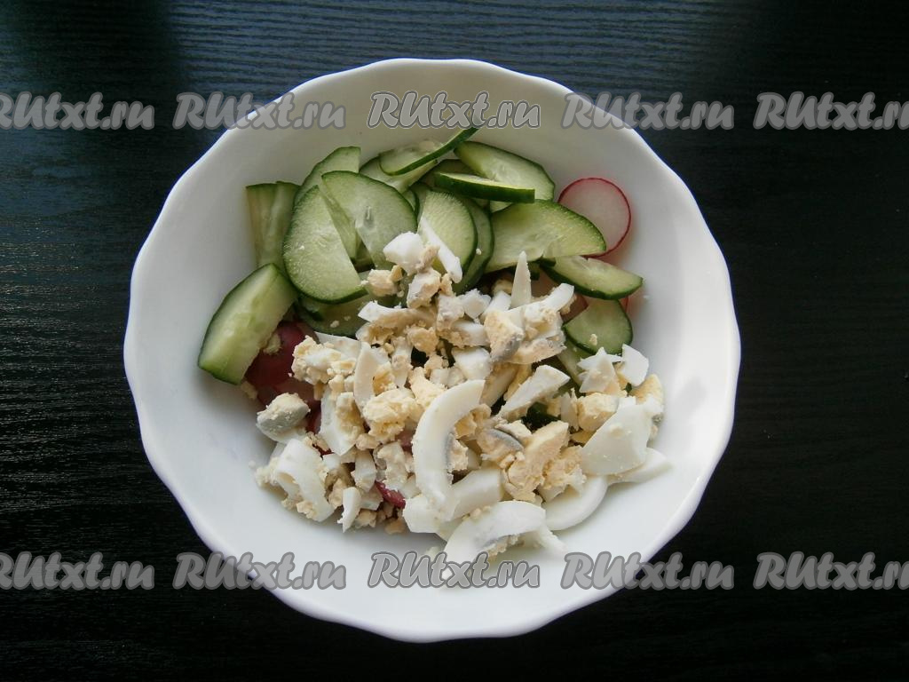 Добавить к редисочке нарезанный полукружочками свежий огурец и крупно нарезанное вареное яйцо.