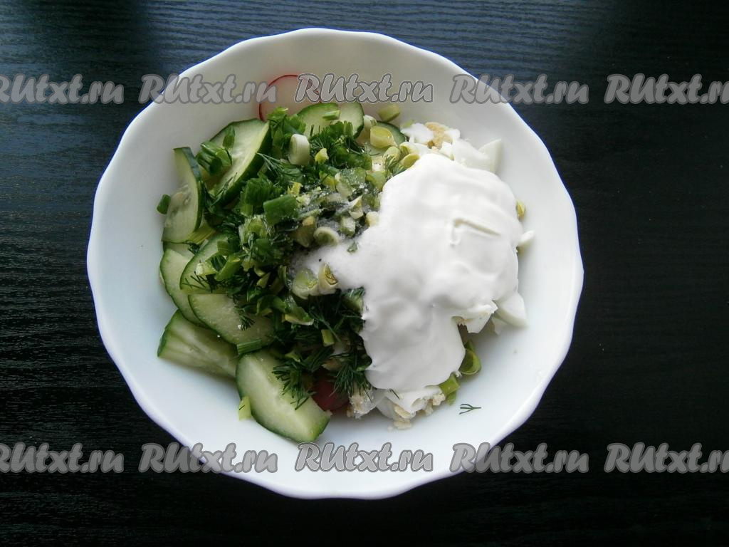 Сюда же добавить соль, сметану, мелко нарезанные зелёный лук и укроп.