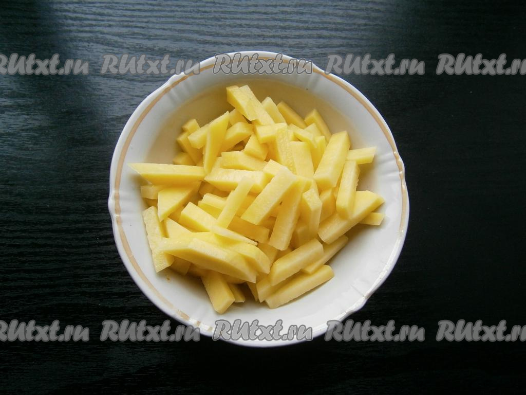 Картофель, лук и морковь очистить. Репчатый лук мелко нарезать, морковь нарезать соломкой. Картошку нарезать небольшими брусочками.
