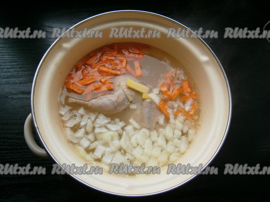 Когда перепелка проварится в течение 30 минут, добавить в бульон картофель, морковку и лук.