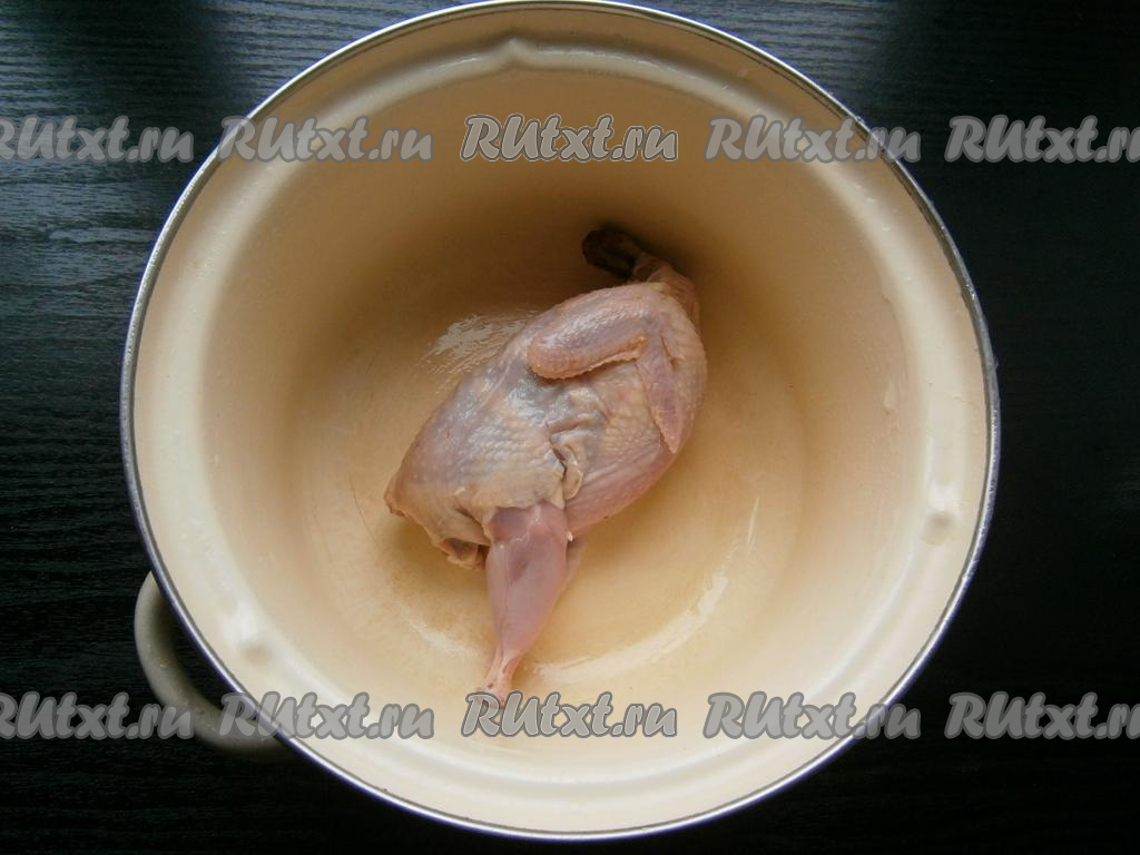 Тушку перепелки хорошенько вымыть, поместить в кастрюлю.