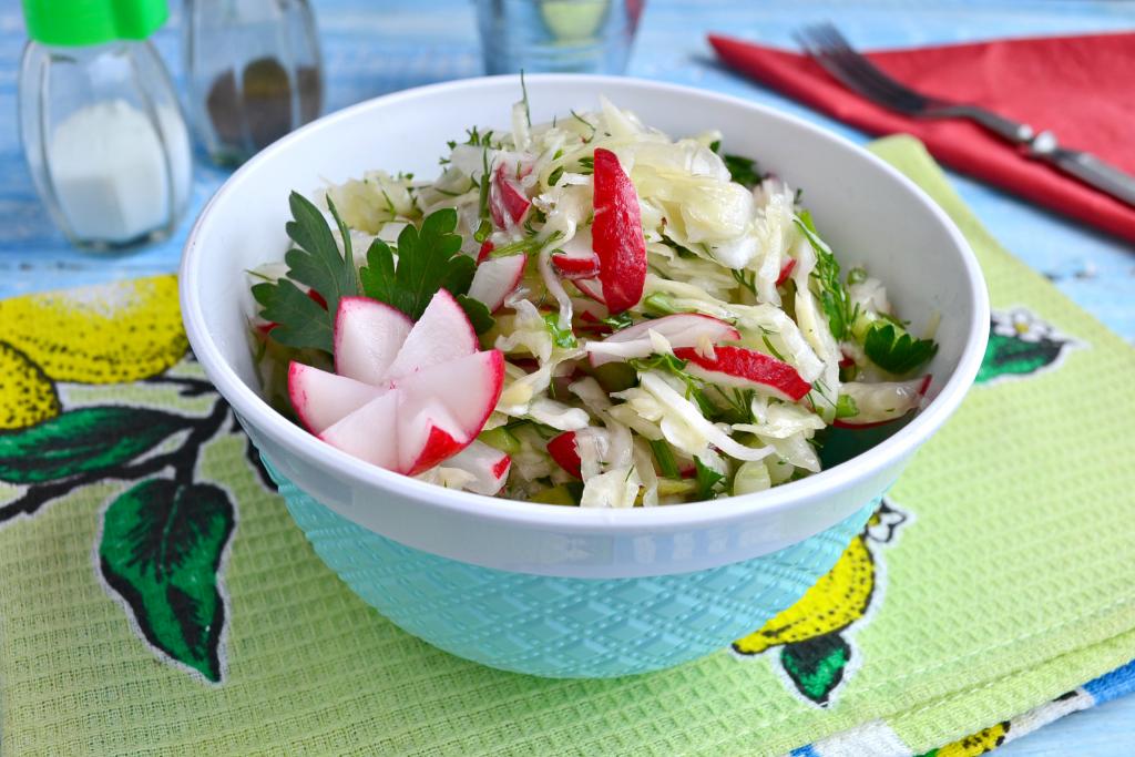Сразу же подать свежий, вкусный, витаминный салат, приготовленный из капусты, огурцов и редиски, к столу, выложив его в салатник.