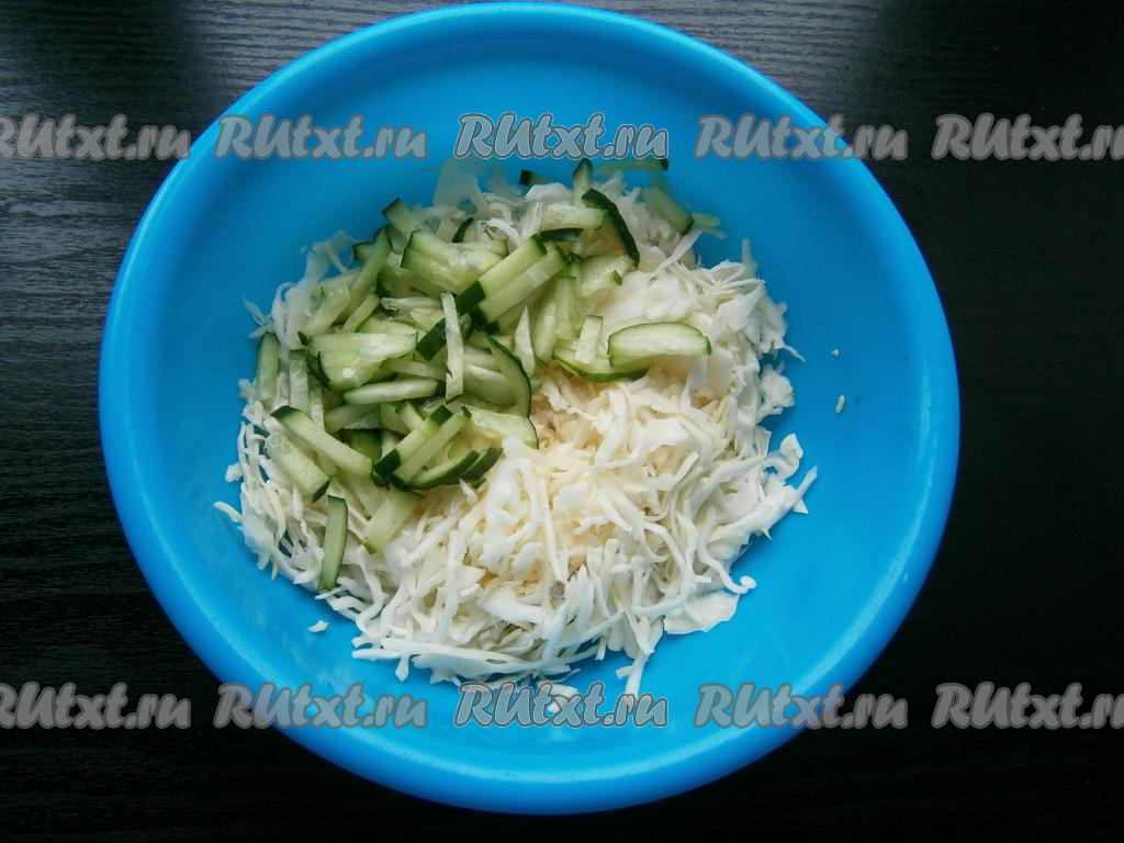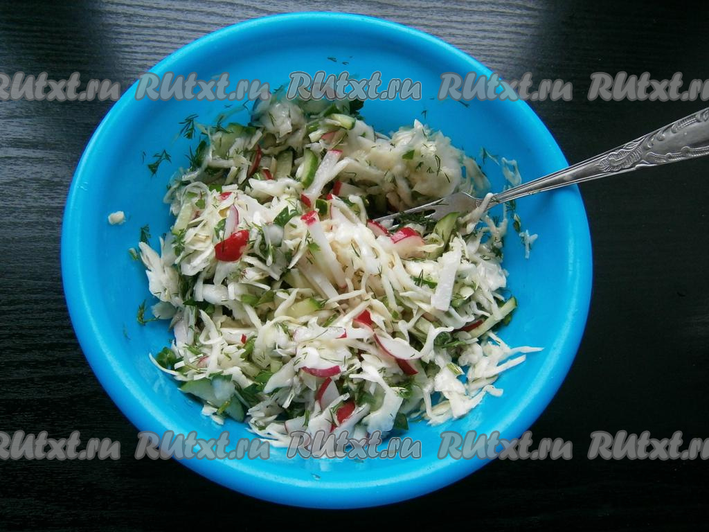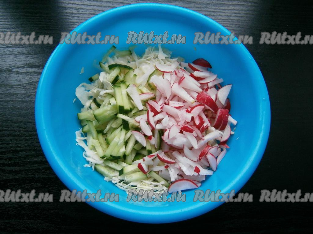 К капусте и огурчику добавить нарезанный брусочками, соломкой или небольшими кусочками редис.