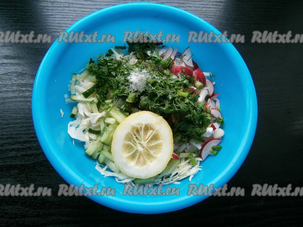 Зелень петрушки, укропа, лука измельчить. Нарезанную зелень, лимонный сок и сахар добавить в салат из капусты, огурцов и редиски.