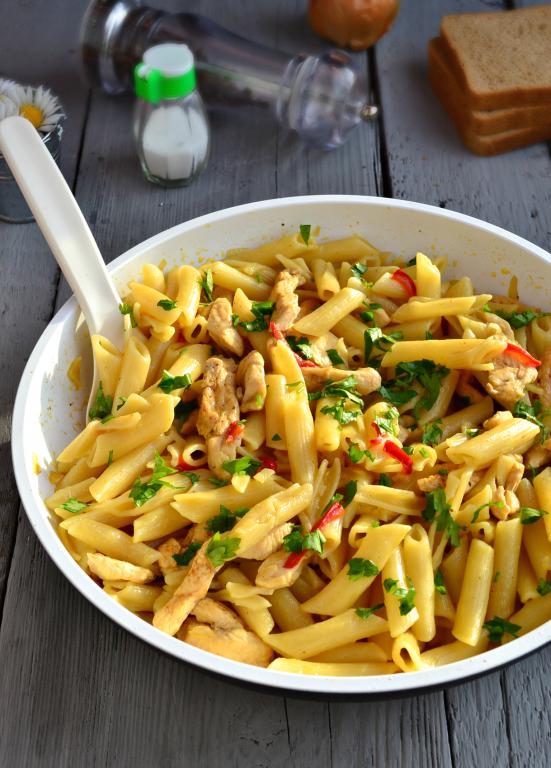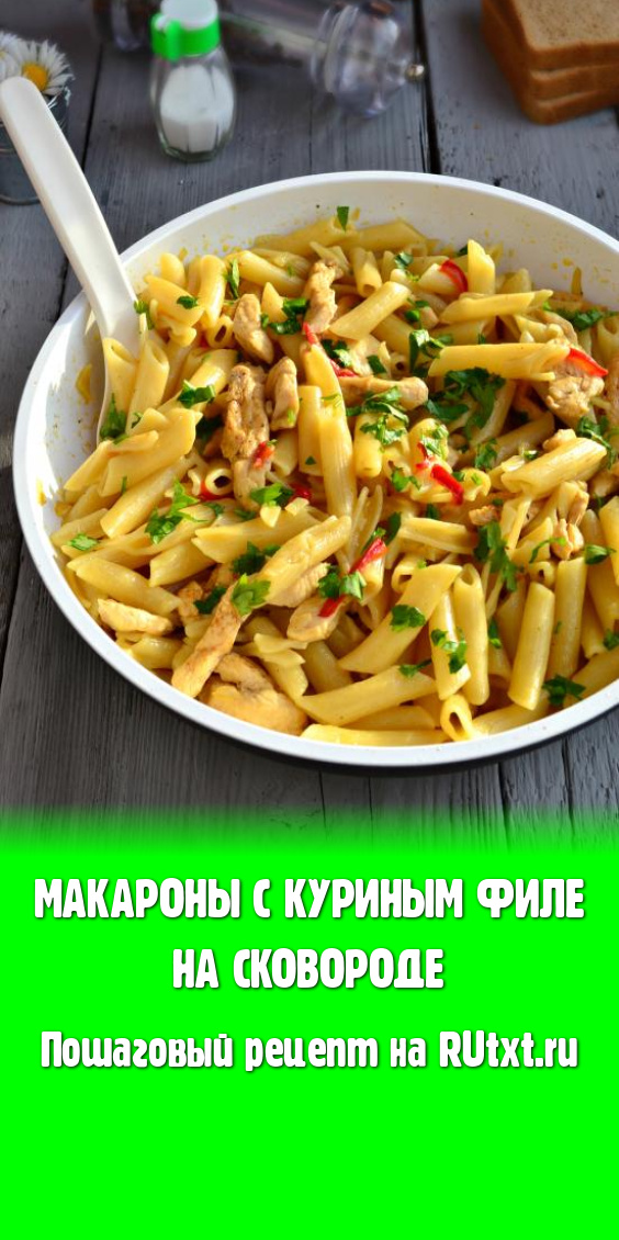 Очень вкусные макароны, приготовленные с куриным филе на сковороде, посыпать зеленью и подать к столу в горячем виде.