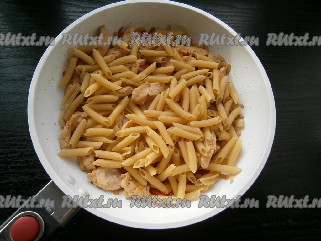 Обжаривать филе с овощами в течение 5-7 минут. Затем добавить в сковороду сухие макароны.