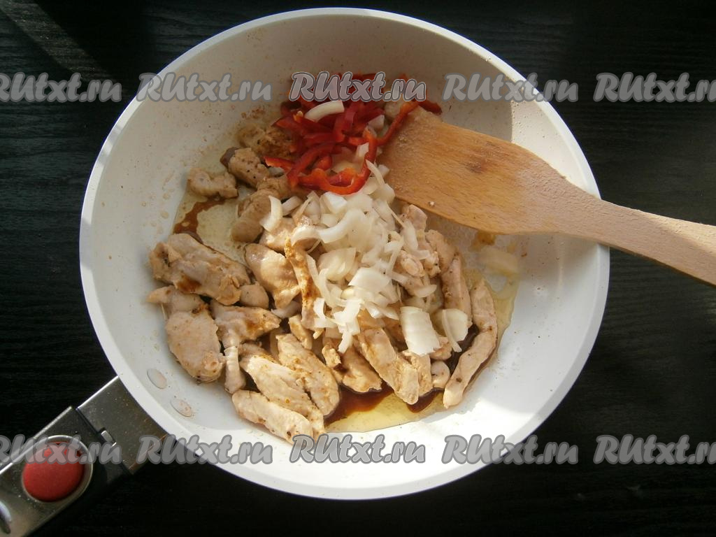 Обжарить филе на среднем огне, помешивая, до изменения цвета, затем добавить к нему лук и болгарский перец, влить соевый соус.