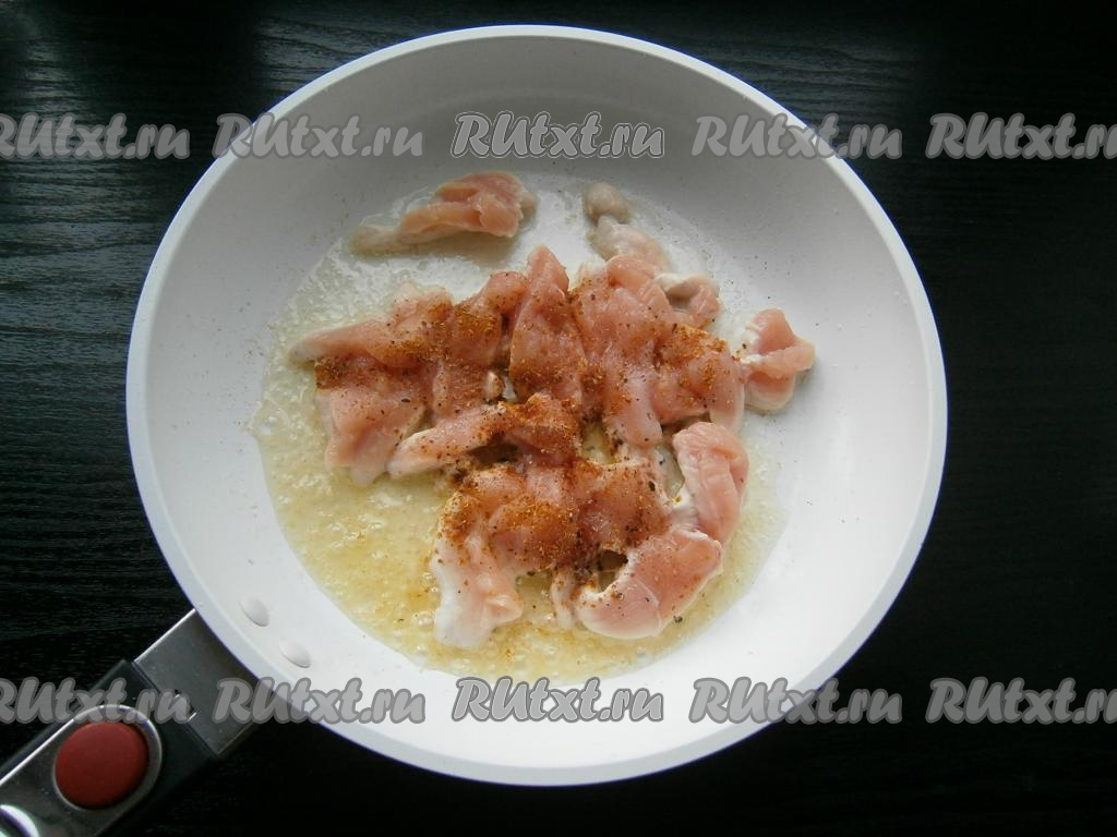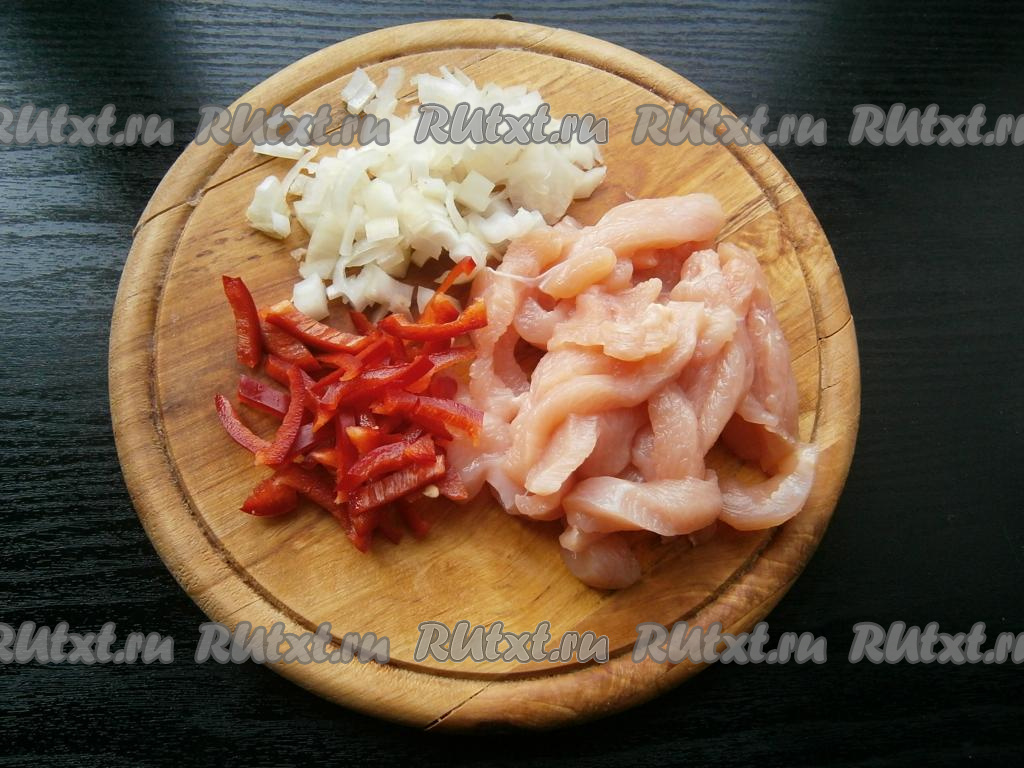 Репчатый лук очистить, нарезать мелкими кусочками, болгарский перец, очищенный от семян, - соломкой, куриное филе - тонкими длинными кусочками.