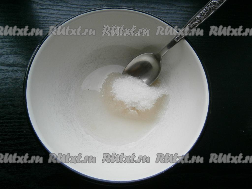 Сахар всыпать в кастрюльку или миску, влить кипяток.