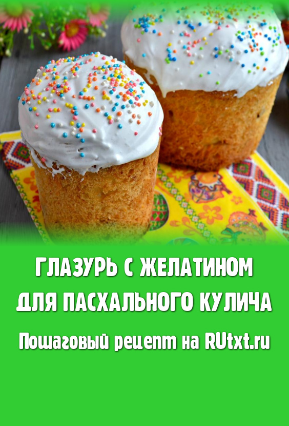 Многие хозяйки сталкивались с тем, что приготовленная ими глазурь или не застывает, или крошится, а то и вообще не получается. Предлагаю вам приготовить отличную глазурь с желатином для пасхального кулича. Такая глазурь получается всегда, не крошится при разрезании выпечки. Эта густая, быстро застывающая глазурь станет прекрасным украшением пасхальных куличей. Единственное условие в работе с ней - покрывать подготовленные куличи глазурью нужно очень быстро, пока она не застыла. Если глазурь все-таки застыла, а вы еще не успели смазать пасхальную выпечку, глазурь можно растопить на водяной бане. Глазури, приготовленной из указанного количества ингредиентов, хватит на 2 кулича диаметром 15 см.