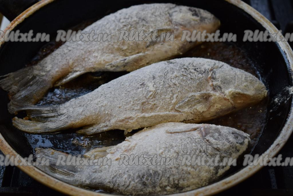 Обжариваем карасей с двух сторон на сильном огне до образования румяной корочки (примерно, 10-12 минут с каждой стороны). Время обжаривания корректируем, в зависимости от размера карасиков: крупных карасей жарим дольше, мелких - быстрее.