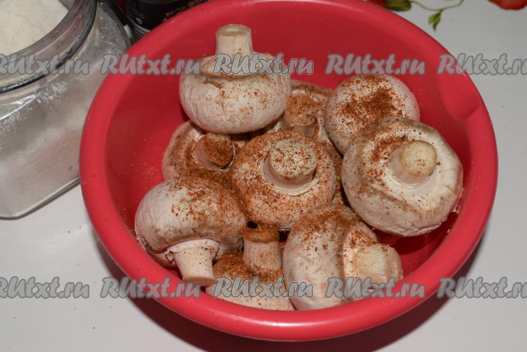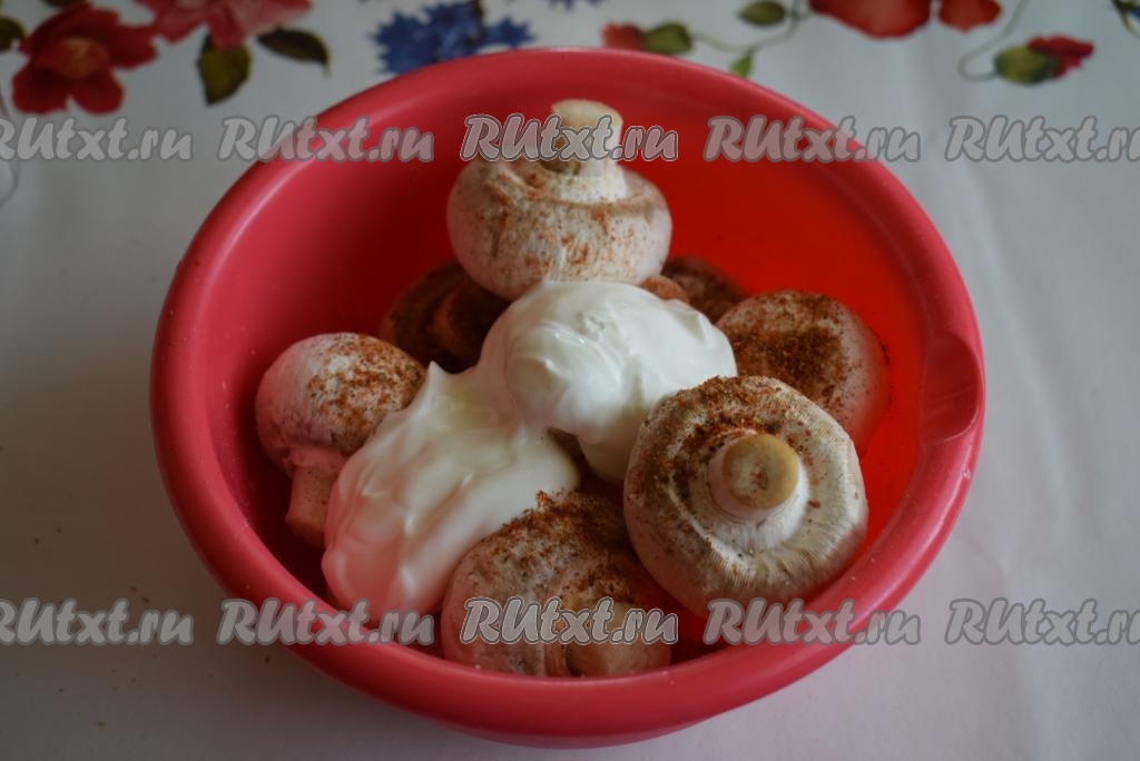 Перемешиваем шампиньоны руками, стараясь, чтобы сметана со специями и солью полностью покрывала каждый гриб.