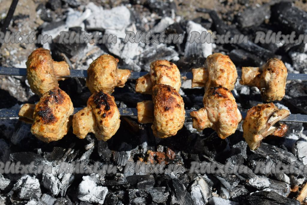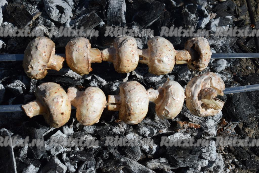 Жарим шашлык из шампиньонов на мангале на седых углях, постоянно поворачивая шампуры и не допуская подгорания грибов. Готовые грибы будут с красивой румяной корочкой (у меня шашлык из шампиньонов обычно готов через 12-15 минут).