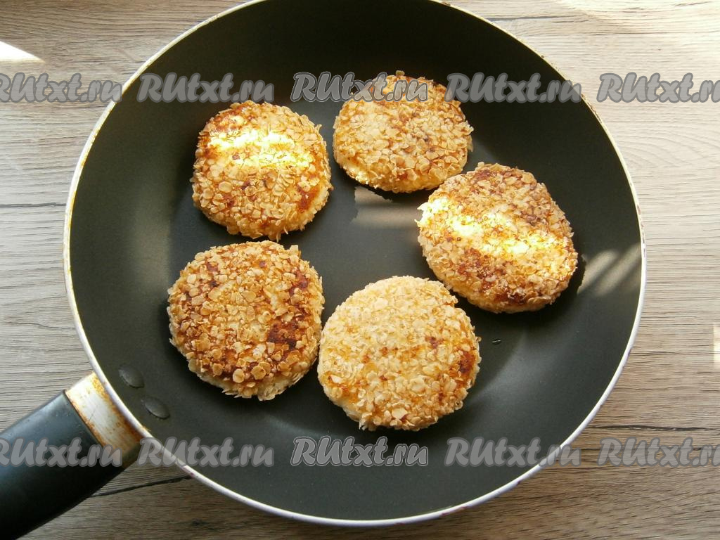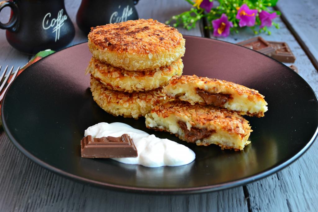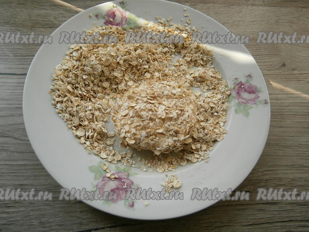 Сырники с шоколадом внутри обвалять со всех сторон в овсяных хлопьях.