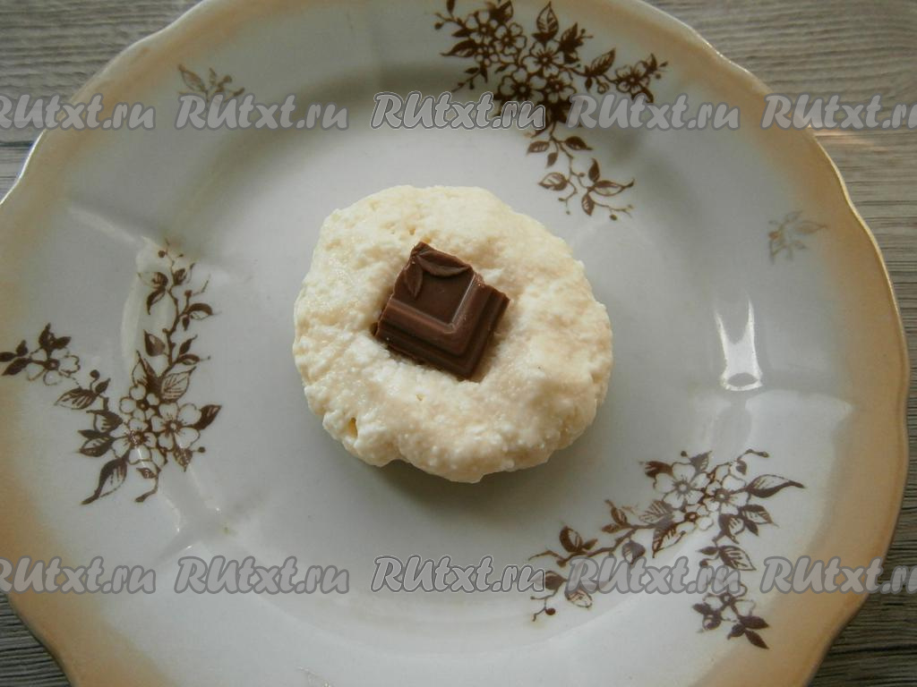 Тесто получится липким, но муки больше добавлять не нужно, чтобы сырники получились нежными. Сформировать влажными руками небольшие лепёшки, в середину которых поместить по кусочку шоколада. Затем слепить из этих лепёшек сырники, чтобы шоколад оказался внутри.