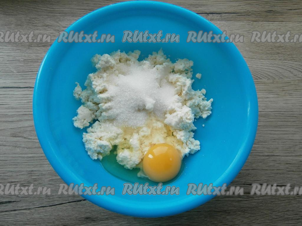К творогу добавить яйцо, щепотку соли, всыпать сахар.
