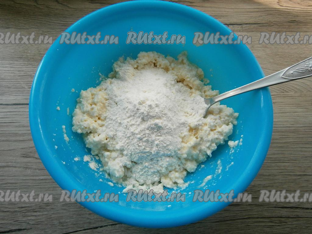 Перемешать творожную массу, добавить муку, ещё раз перемешать.
