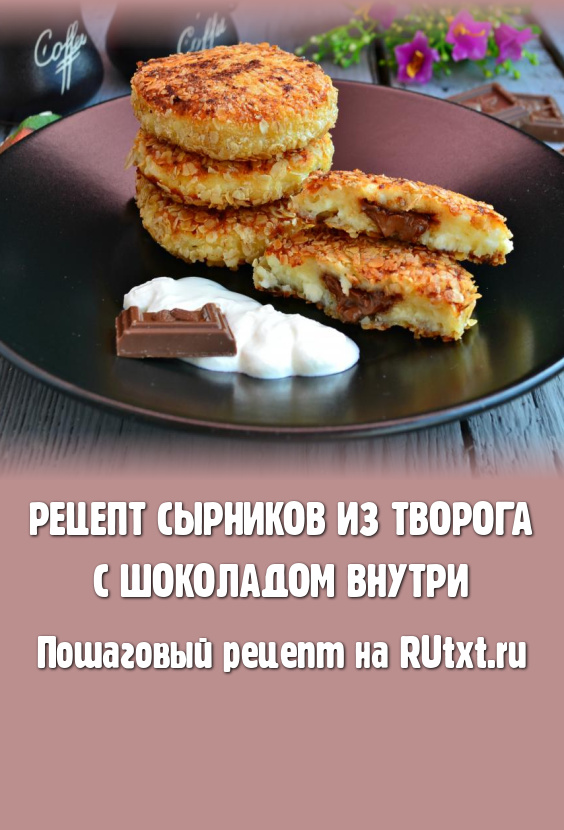 Сырники, приготовленные из творога с шоколадом внутри, подать к столу горячими со сметаной. В этих сырничках замечательно сочетаются хрустящая корочка, нежнейшая творожная основа и тающая во рту начинка. Это наивкуснейшее блюдо несомненно понравится всей семье!