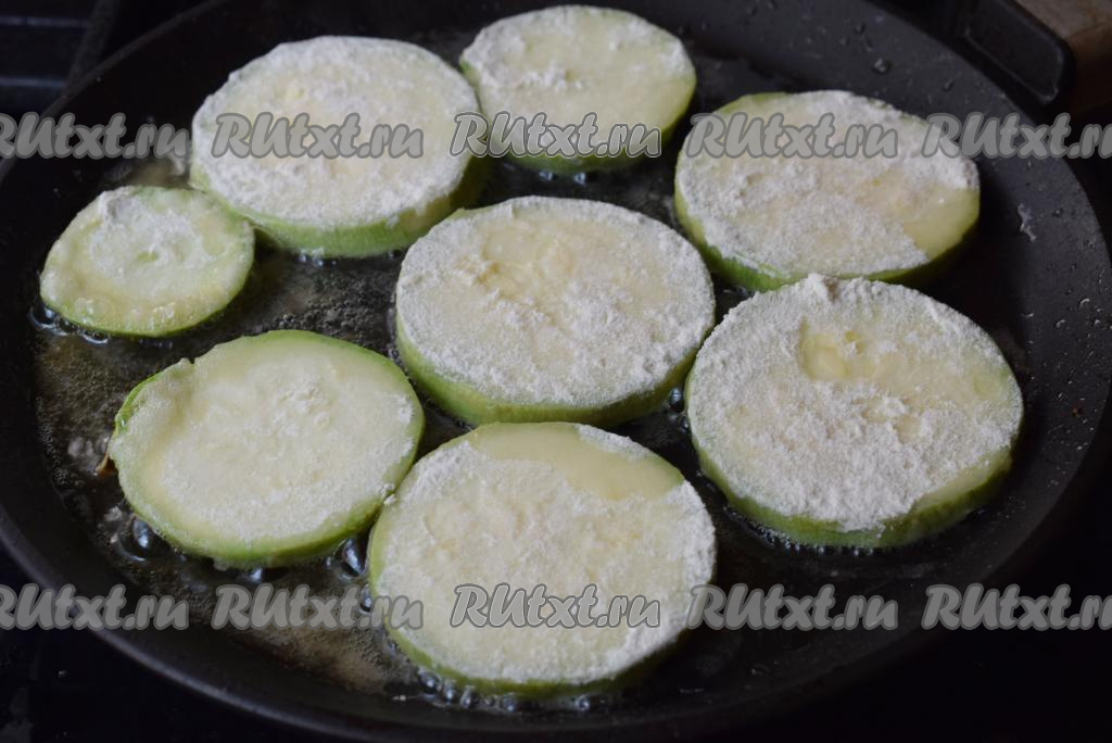 Выкладываем кружочки кабачков, запанированные в муке, на разогретую сковороду с растительным маслом.