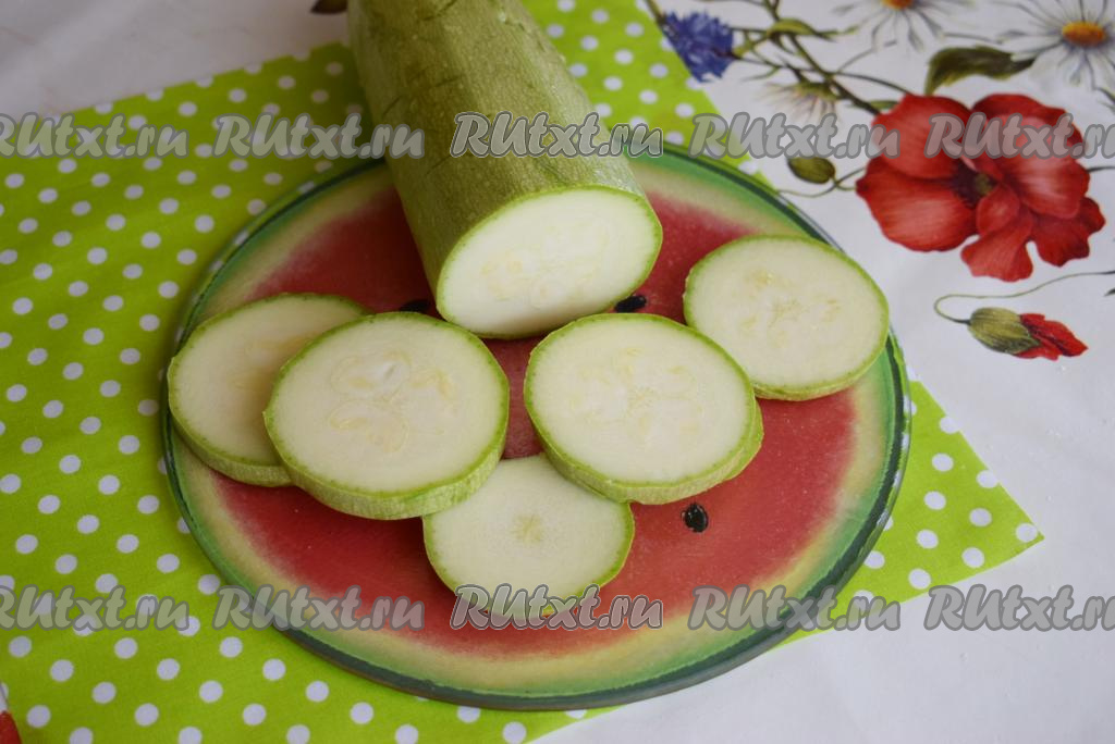 Кабачок моем (если кабачок не очень молодой, тогда очистите его от кожуры), обсушиваем и режем на кружочки шириной 4-5 мм.