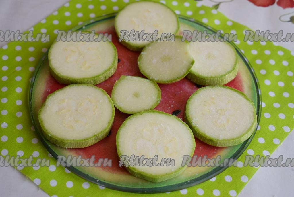 Дадим постоять кабачкам, примерно, 5 минут. За это время кабачки вступят в реакцию с солью и пустят сок. Уберем выделившийся сок, промокнув кружочки кабачков бумажными полотенцами.