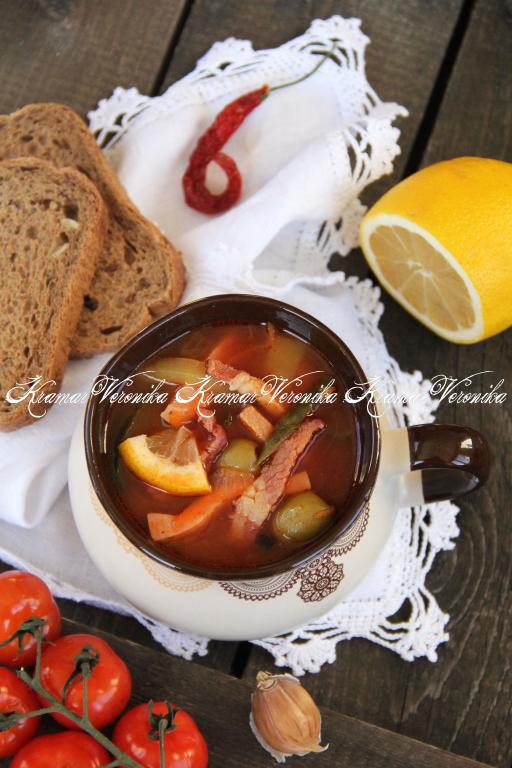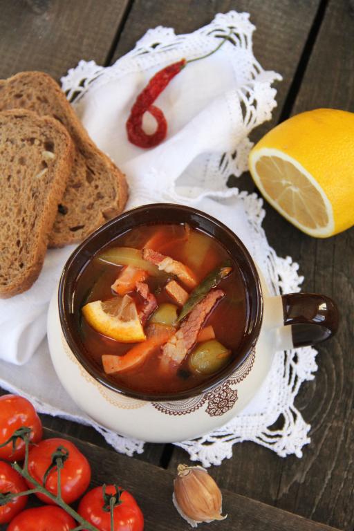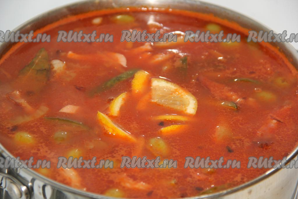 Добавить в солянку оливки, дольки лимона, соль по вкусу и лавровый лист, варить солянку 10 минут, затем снять с огня, накрыть крышкой и дать настояться.
