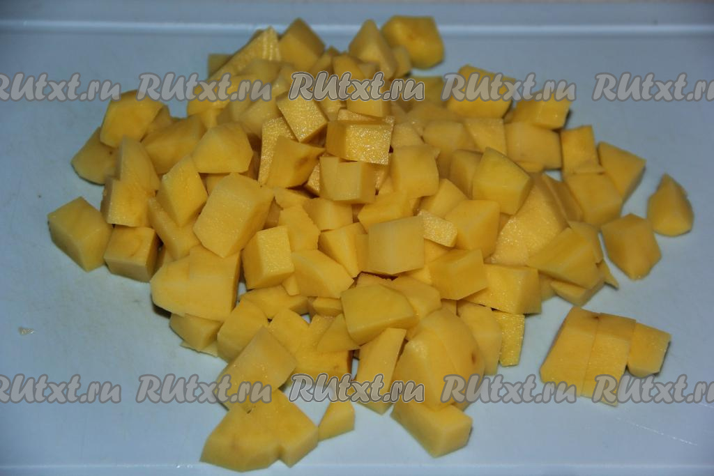 Картофель очистить и нарезать на кубики среднего размера.