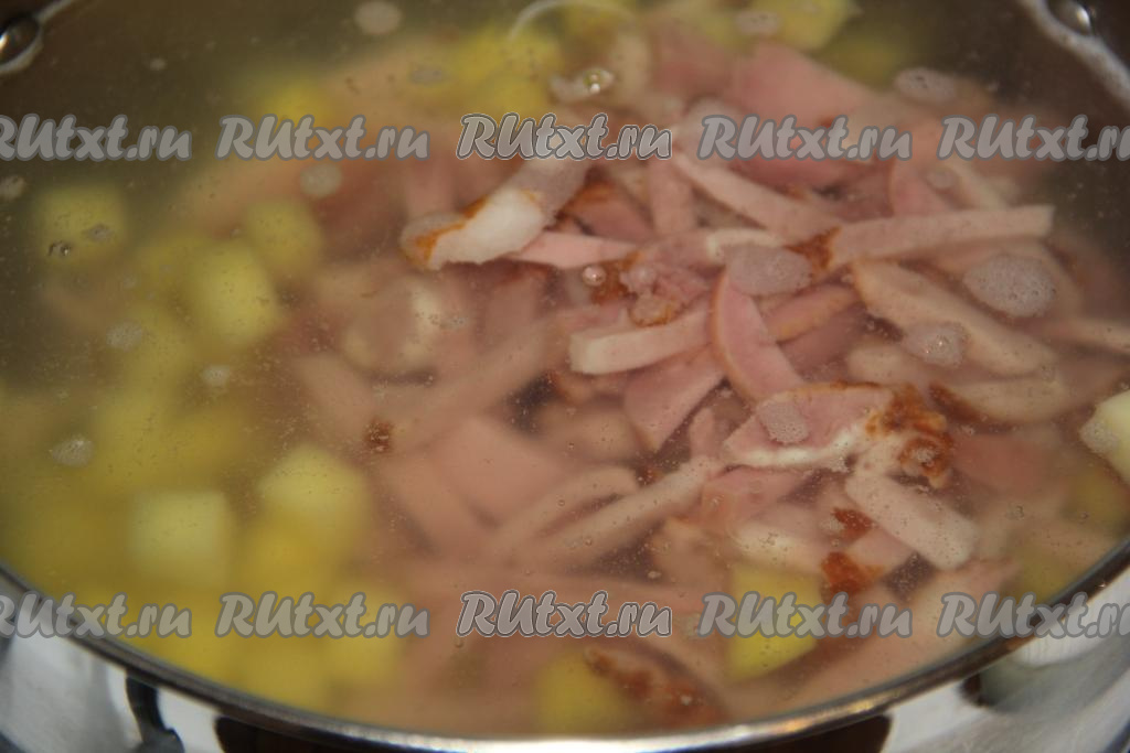 Выложить нарезанное колбасное ассорти в кастрюлю, варить минут 5-7 с момента закипания на небольшом огне.