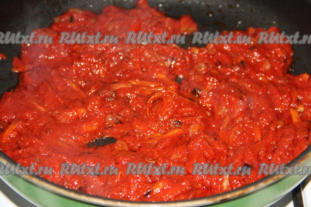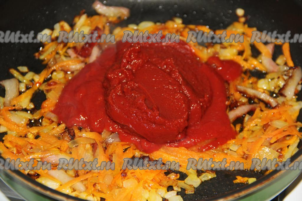 Добавить в сковороду томатную пасту, перемешать и потушить пару минут.