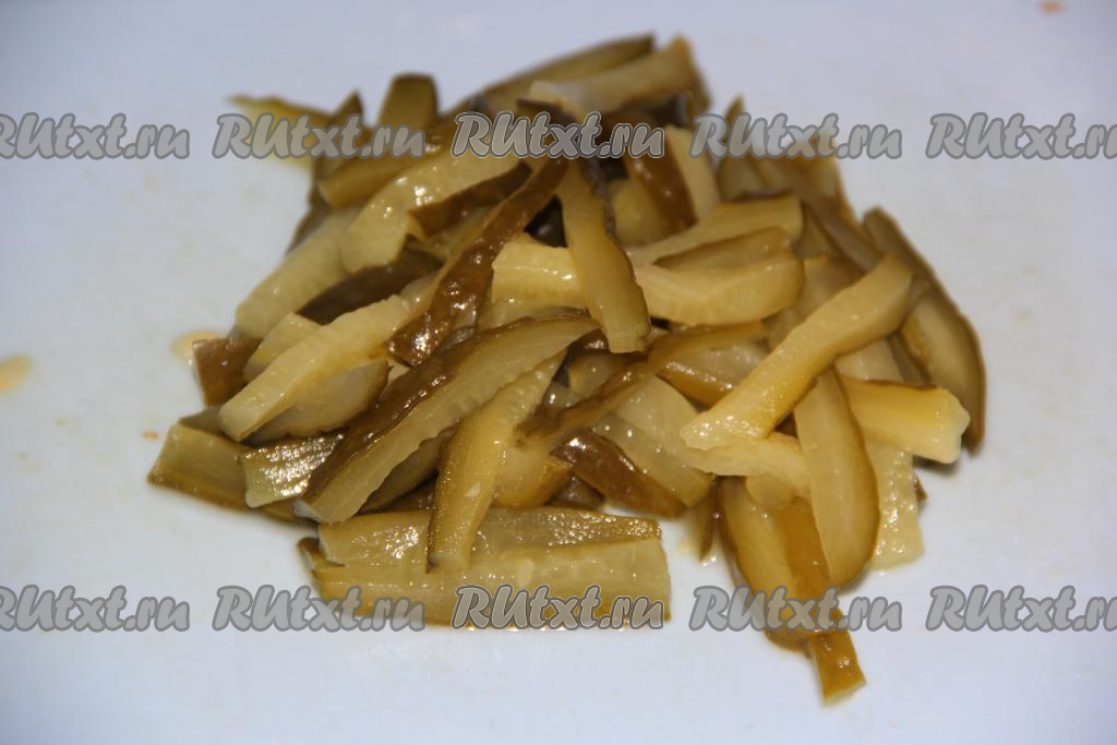 Огурчики нарезать длинными брусочками.