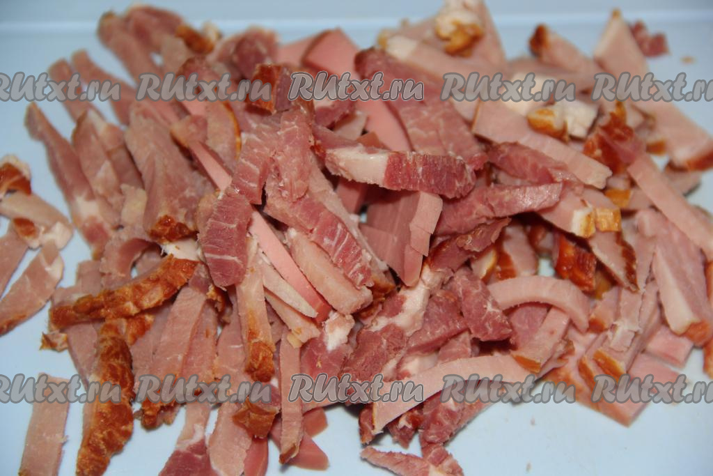 Колбасу или колбасно-мясное ассорти нарезать на длинные брусочки (небольшую часть нарезанных колбасных изделий отложить для обжарки).
