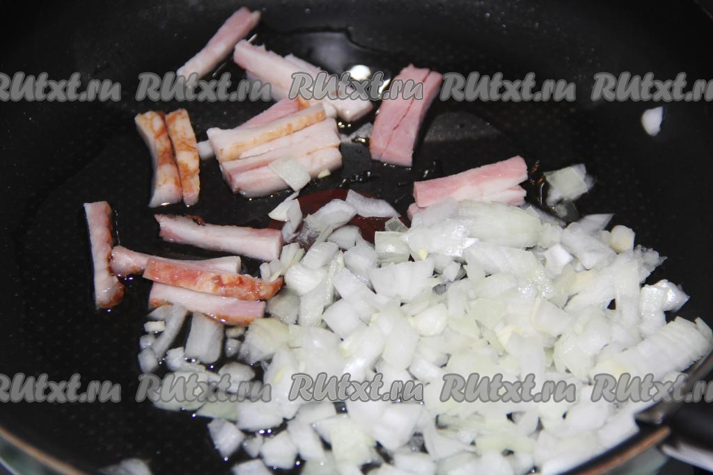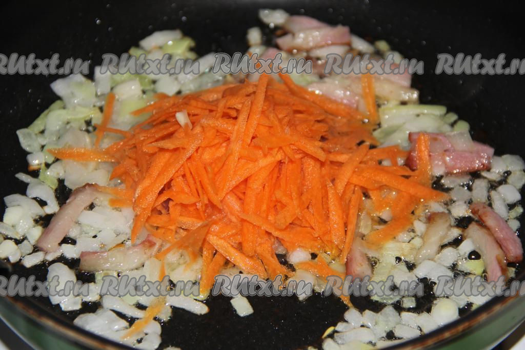 Морковь очистить, натереть на крупной тёрке, выложить на сковороду с колбасой и луком, обжарить в течение 3-5 минут, иногда помешивая.