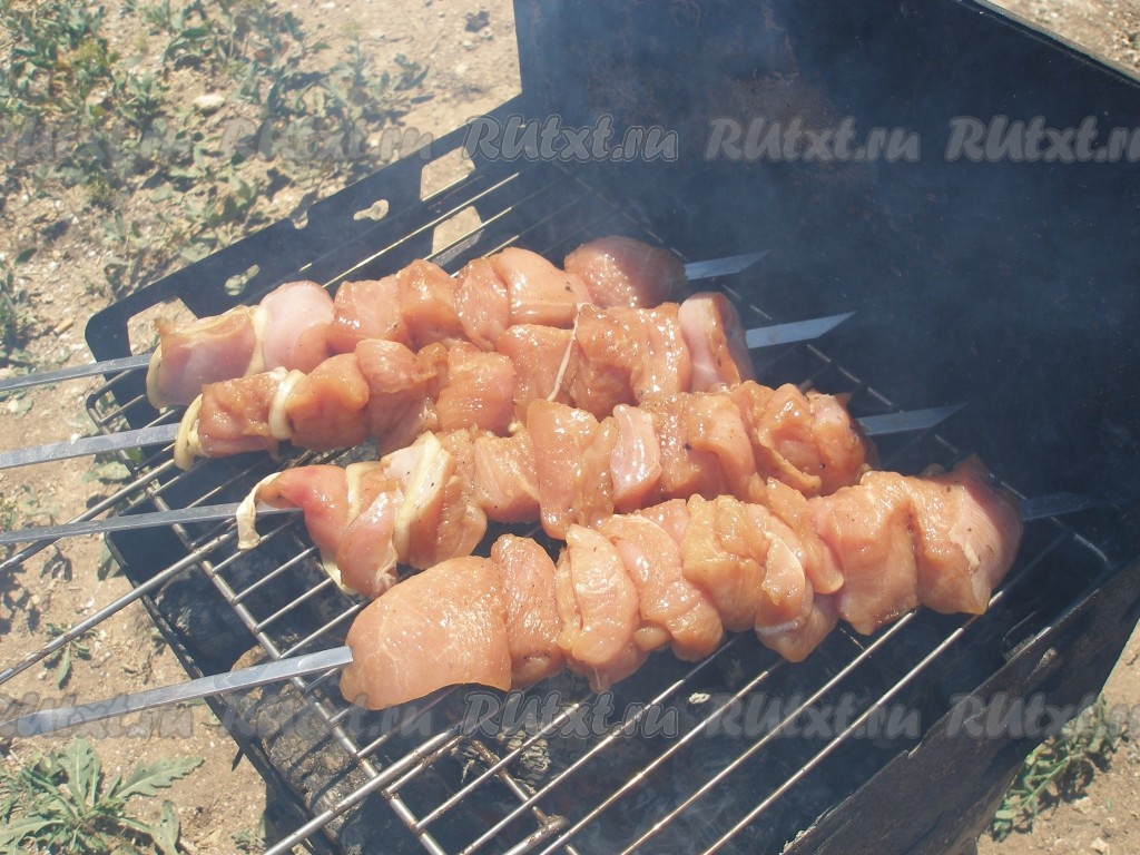 Шампуры уложить на мангале, жарить шашлыки, постоянно переворачивая, чтобы индейка не пригорела.